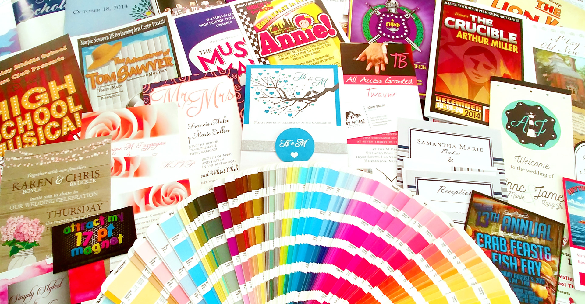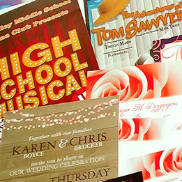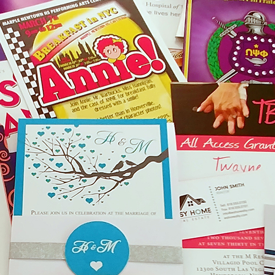 Stationery, business cards, memo pads, note cards, postcards, posters, newsletters, file folders, handbooks, calendars, catalogs, annual reports, brochures, booklets, business forms, carbonless forms, direct mail, flyers, labels and custom designed wedding invitations.